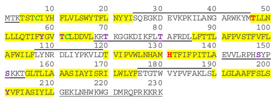 According to UniProtKB/SwissProt (https://www.uniprot.org, accessed on 20 February 2021) C6ORF105 encodes Protein Q96IZ2. UniProtKB lists 3 described isoforms and 4 potential isoforms that are computationally mapped. Isoform 1 (Q96IZ2-1) has been chosen as the canonical sequence with 230 aminoacids and a molecular weight of 27 kDa. The protein has six predicted transmembrane domains marked as yellow highlight on the sequence (Figure 1). Cytoplasmic domains are under-lined and extracellular domains are over-lined. Threonine (T47) and Histidine (H131) are FAHFA (fatty acid esters of hydroxy fatty acids) hydrolase activity sites [35]. Post-translational modifications predictions include two palmitoylation sites possible at cysteine residues C7 and C62; no N-glycosylation sites, but several O-glycosylation sites possible; and, phosphorylation possible at serine residues S148 and S151, as well as threonine residues T61, T70 and T80, and tyrosine residues Y58 and Y201 (Figure 1).