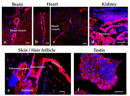 Immunofluorescence staining for ADTRP in mouse tissues. IMF and confocal microscopy illustrate the localization of ADTRP (Cy3, red) in blood vessels of the brain (a) and heart (b,c), kidney tubules (d), epidermis and hair follicle (e) and testis (f). Blue: nuclei. Bars: 50 µm.