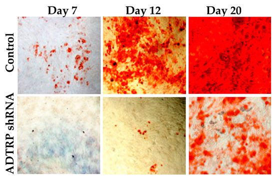 Our own experiments addressing the role of ADTRP in human BM-MSC also showed decreased ADTRP mRNA expression after induction with osteogenesis medium. Comparison between Control BM-MSC and cells where ADTRP was down-regulated using shRNA shows significant impairment of mineralization in ADTRP-deficient cells, illustrated by Alizarin Red staining (Figure 6).