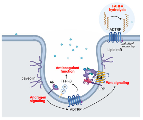 Since ADTRP has a wide tissue expression and it is evolutionary conserved having orthologs in all classes of vertebrates, it is expected to play essential functions. However, ADTRP gene deletion in mice was compatible with survival, suggesting the existence of compensatory mechanisms. Structure-function studies may help identify the primary role of ADTRP. Proteins with six transmembrane spanning domains have a variety of functions, including enzymatic activities, membrane transporters, and channels. Membrane anchoring of ADTRP suggests a potential role as membrane microdomain organizer, which may integrate some of the described cell surface activities, such as the modulation of TFPI-dependent anticoagulant function, Wnt and androgen signaling, and hydrolysis of membrane lipids (Figure 7).