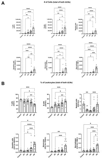 Previous reports have focused primarily on studying leukocyte infiltration into lymphedematous tissue to explain their effects on the existing lymphatic vasculature and the resultant swelling. Few studies have examined how leukocyte populations in downstream lymph nodes (LNs) respond during lymphedema. Garcia Nores et al. found that CD4+ T cells were activated by dendritic cells in regional LNs and migrated to the site of injury to initiate lymphedema []. Leukocyte populations within LNs draining the skin of mice lacking dermal lymphatic vessels were also previously reported in genetic models of disease [,]. To our knowledge, no studies have investigated how multiple leukocyte populations in the draining lymph nodes (dLNs) change as swelling worsens during lymphedema progression, however, which is of key clinical importance since the onset of lymphedema is a delayed process and fluid at the site of disease onset is continuously drained to downstream LNs [].