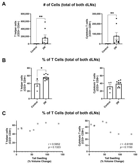 Previous studies have identified CD4+ T helper cells as key drivers of lymphedema progression, including their roles in increasing tissue fibrosis and reducing lymphatic function [,]. To analyze how T cell subpopulations in the dLNs change during disease progression in our model, we used flow cytometry to again analyze cell populations in the dLNs, this time analyzing changes in T helper cells (CD3+ CD4+) and cytotoxic T cells (CD3+ CD8+). Given the observed changes in T cells shown in Figure 1, we quantified these T cell subpopulations only at 2W following lymphedema surgery, when the increase in T cells in the dLNs was first observed. Compared to an unoperated control, both T helper cells and cytotoxic T cells were increased in dLNs at the 2W timepoint (Figure 2A). However, we found that T helper cells as a percentage of T cells increased in dLNs at the 2W timepoint, while there was no measured change in cytotoxic T cells as a percentage of T cells (Figure 2B). We also found a positive correlation between change in tail volume and percentage of T cells for T helper cells (p = 0.1323), while there was a negative correlation for cytotoxic T cells (p = 0.1150) (Figure 2C). These results show that CD4+ T helper cells make up a larger proportion of T cells in the dLNs as swelling manifests during lymphedema progression. This data corresponds well with previous studies which have shown similar increases in CD4+ T helper cells in lymphedematous tissue and have implicated CD4+ T helper cell migration from dLNs to tissue as a key driver of lymphedema [,].
