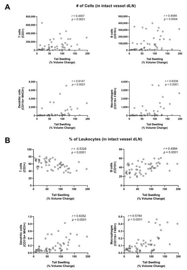 Leukocyte expansion in dLNs correlates with increase in tail volume after lymphedema surgery. (A) Spearman’s rank correlation between number of cells in intact vessel dLN and percent volume change following single vessel ligation lymphedema surgery for T cells, B cells, dendritic cells, and macrophages. (B) Spearman’s rank correlation between fraction of leukocytes in intact vessel dLN and percent volume change following single vessel ligation lymphedema surgery for T cells, B cells, dendritic cells, and macrophages.
