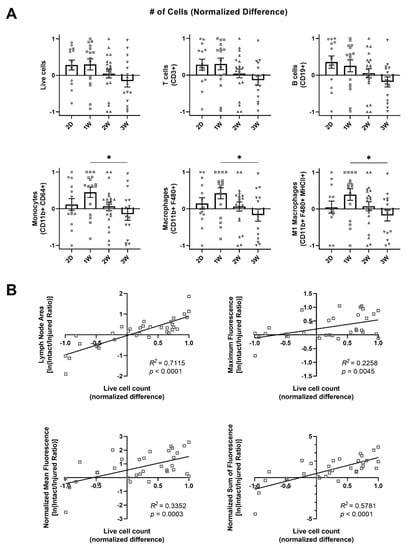 Differential leukocyte expansion between the dLNs is correlated with differential nanoparticle accumulation. (A) Normalized difference between intact and injured lymph nodes for number of live cells, T cells, B cells, monocytes, macrophages, and M1 macrophages at 2D, 1W, 2W, and 3W timepoints. Kruskal–Wallis tests with Dunn’s multiple comparisons were used to compare between timepoints. Mean ± s.e.m. * (p < 0.05). (B) Linear correlations and Pearson’s correlation coefficient (R2) between normalized difference of number of live cells and the natural logarithm of intact/injured ratio for lymph node area, maximum fluorescence, normalized mean fluorescence, and normalized sum of fluorescence.