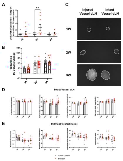 Leukotriene B4 (LTB4) is a known chemoattractant and has been shown to play a bimodal role in lymphangiogenesis, with low concentrations being lymphangiogenic and high concentrations being anti-lymphangiogenic [,,]. Previous studies suggest that LTB4 levels increase during lymphedema, and these high levels of LTB4 in lymphedema inhibit lymphangiogenesis and resolution of swelling, thus driving progression of the disease []. We were interested in studying how antagonism of LTB4 may modulate lymphatic function during lymphedema progression. To approach this question, we treated mice with daily injections of bestatin, an LTB4 antagonist, starting 3 days after surgery. To determine how lymphatic pump function is altered due to bestatin treatment during lymphedema progression, we used NIR imaging techniques that have been previously described [,,,]. At 1W, 2W, and 4W following surgery to induce lymphedema, we injected a 20 kDa PEG molecule conjugated to an 800IR CW NHS ester dye (LI-COR Biotechnology, Lincoln, NE, USA) intradermally into the mouse tail. Bestatin treatment started three days after surgery and continued daily until the 4W timepoint. As the active contractions from lymphatic pumping create intensity fluctuations, movement of these “packets” that are reflective of the vessel stroke volume can be quantified using live NIR imaging. In so doing, we found that lymphatic function as determined by measuring the lymphatic contractile transport of the tracer normalized to the presurgery baseline was significantly increased at 2W in bestatin-treated mice compared to the saline group (Figure 6A), an effect that was lost by 4W. Other metrics, including lymphatic contractile frequency, amplitude, and pumping pressure showed no significant change in bestatin-treated mice compared to the saline group (Figure S5). Even with this measured change in lymphatic contractile function, bestatin did not reduce tail swelling compared to the saline group at any of the timepoints analyzed (Figure 6B). To measure nanoparticle uptake to and accumulation within the dLNs, we harvested the dLNs at 1W, 2W, and 3W after single vessel ligation surgery. As described previously, one day prior to LN harvest, NIR-labeled NPs were injected intradermally into the tail. After LN harvest, we again used our NIR imaging setup to take fluorescent images of the dLNs and quantify maximum, normalized mean, and normalized sum of fluorescence (Figure 6C). We found that bestatin-treated mice had increased NP accumulation in the intact vessel dLN at 3W compared to the saline control group, quantified through both normalized mean fluorescence and normalized sum of fluorescence (Figure 6D). We also used multiple linear regression to analyze how both treatment and time correlated with NP fluorescent measurements. The coefficient of the interaction term between treatment and time in the linear regression model was significantly correlated for normalized sum of fluorescence (p = 0.0307) and close to significant for normalized mean fluorescence (p = 0.0509), showing that the slopes of these NP fluorescent measurements in the intact vessel dLN versus time were different between treatment groups. However, fluorescence in the injured vessel dLN at 3W showed no difference between the bestatin and saline groups (Figure S6). Additionally, there were no significant differences in the intact/injured ratio for these fluorescence metrics between the bestatin and saline groups (Figure 6E). These results suggest that LTB4 antagonism through bestatin treatment increases transport and accumulation of NPs to the intact vessel dLN during lymphedema progression. The return of fluid transport to the injured vessel dLN, however, was not significantly altered by bestatin treatment. Taken together, these results suggest that antagonism of LTB4 through bestatin treatment increases transport and accumulation of NPs to the dLNs, specifically in the vessel left intact following single vessel ligation surgery.