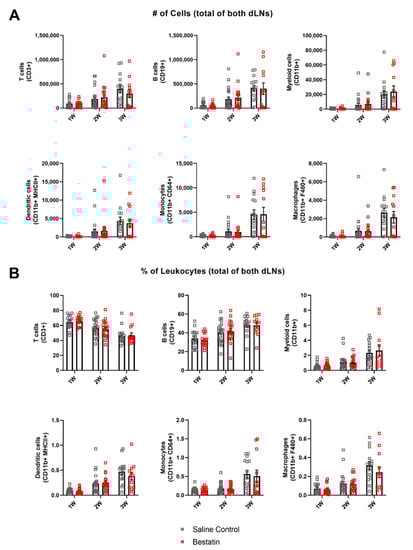 2.7. Bestatin Treatment Has No Significant Effect on Magnitude of Immune Response in dLNs during Lymphedema Progression