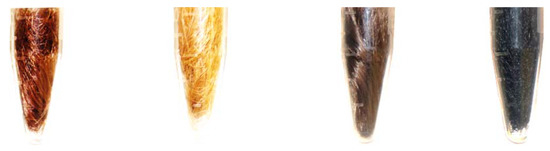Images of hair samples obtained from donors of different skin phototypes (from left to right): red hair (phototype I), blond hair (phototype II), chestnut hair (phototype III) and black hair (phototype V).
