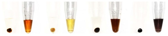 Images of isolated melanins showing two fractions: spin-down melanosomes (left-hand tubes) and supernatants of melanin nanoaggregates (right-hand tubes).