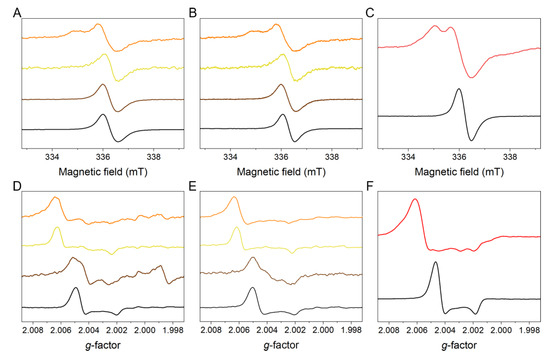 EPR spectra of the studied melanins obtained in X-band (A–C) and W-band (D–F). (A,D) show spectra of melanosomes, whereas (B,E) show spectra of melanin nanoaggregates. Color lines indicate the following samples: orange (red hair), yellow (blond hair), brown (chestnut hair) and black (black hair). (C,F) show spectra of synthetic melanin models used as standards: Cys-L-DOPA melanin (red) and DOPA melanin (black).