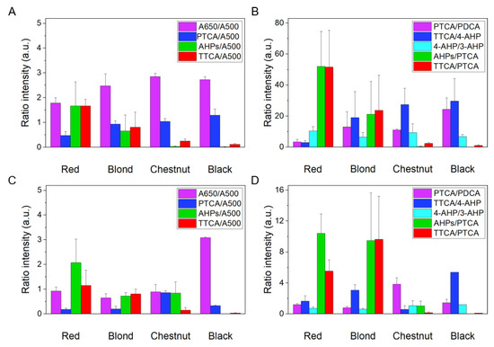 Ratios of the examined markers for melanosomes (A,B) and melanin nanoaggregates (C,D) of the studied melanins. Values represent mean ± SEM. 4-AHP/3-AHP, AHPs/PTCA, and TTCA/PTCA ratios in melanosomes are multiplied by a factor of 10 to increase clarity. A650/A500 ratios are also multiplied by a factor of 10.