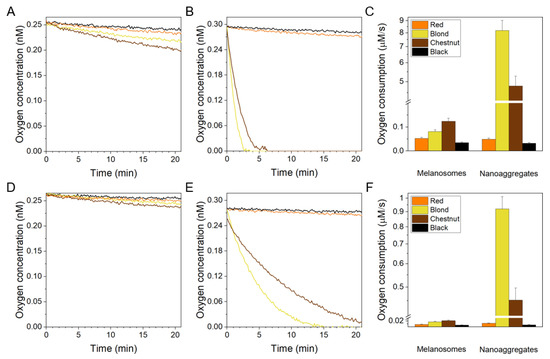 Photoinduced consumption of oxygen by natural melanin pigments under 365 nm (A–C) and 445 nm (D–F) irradiation. (A,D) show results for melanosomes whereas (B,E) show results for melanin nanoaggregates. (C,F) show histograms of initial intensities of oxygen consumption for both melanosomes and nanoaggregates of different hair melanins. Colors lines indicate the following samples: orange (red hair), yellow (blond hair), brown (chestnut hair), and black (black hair).