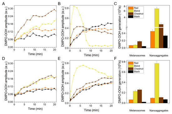 Kinetics of superoxide anion generation, detected as the formation of DMPO-OOH spin adduct during irradiation of the samples with 365 nm (A–C) and 445 nm (D–F). (A,D) show results for melanosomes whereas (B,E) show results for melanin nanoaggregates. (C,F) show histograms of initial velocities of DMPO-OOH generation by both melanosomes and nanoaggregates of different hair melanins. Color lines indicate the following samples: orange (red hair), yellow (blond hair), brown (chestnut hair), and black (black hair).