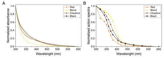 Normalized UV-Vis absorption spectra (A) and action spectra of singlet oxygen photogeneration (B) for melanin nanoaggregates from different hair samples.