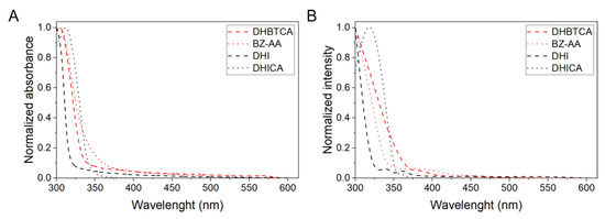 Normalized UV-Vis absorption spectra (A) and action spectra of singlet oxygen photogeneration (B) for melanin monomers.