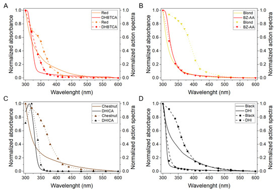Absorption spectra of melanin nanoaggregates obtained from different hair and of selected melanin monomer units, and their corresponding action spectra of oxygen photogeneration for: red hair and BT monomers (A), blond hair and BZ monomers (B), chestnut hair and DHICA monomers (C), and black hair and DHI monomers (D). Solid lines depict absorption, whereas dashed lines with symbols characterize melanin monomer units.