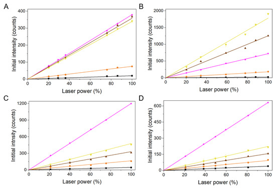 Determination of quantum yield of singlet oxygen photogeneration by melanin nanoaggregates from different hair at: 300 nm laser excitation (A), 332 nm laser excitation (B), 365 nm laser excitation (C), and 445 nm laser excitation (D). Color lines indicate the following samples: orange (red hair), yellow (blond hair), brown (chestnut hair), and black (black hair). Magenta in A, B, and D represents fluorescein as a reference sample, whereas magenta in C represents proflavine used as a standard.