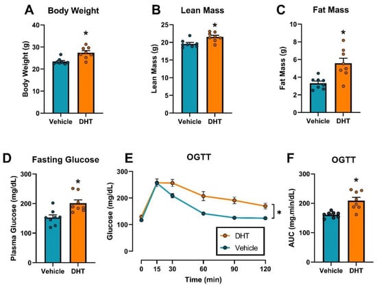 Effect of DHT on body weight and composition, and glucose homeostasis. (A) Body weight (n = 8/group). (B) Fat mass by EchoMRI (n = 8/group). (C) Lean mass by EchoMRI (n = 8/group). (D) Fasting glucose (n = 8/group). (E) Time-course of Oral glucose tolerance test (OGTT) (n = 8/group). (F) Area under the curve (AUC) from OGTT (n = 8/group). Data analyzed by t-test. *: p < 0.05.