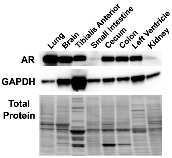 We analyzed androgen receptor protein expression in the tissues considered for SARS-CoV-2 entry proteins expression regulation to validate that those tissues could be subjected to androgen modulation. The androgen receptor protein was expressed in all tissues analyzed in untreated female mice (Figure 2). The androgen receptor protein was detected in the lung, brain, tibialis anterior, small intestine, cecum, colon, left ventricle, and kidney. These results suggest that SARS-CoV-2 entry proteins could be subjected to androgen regulation in all the aforementioned tissues.