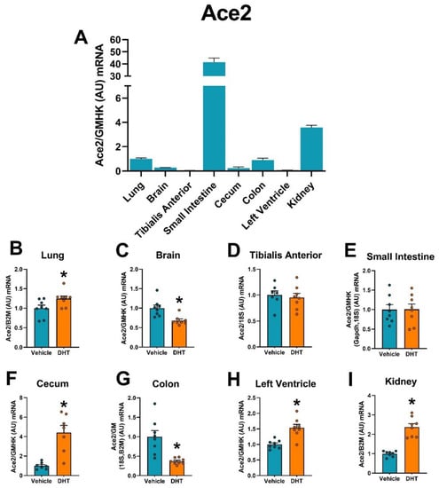 Ace2 mRNA expression regulation by DHT in different tissues. Ace2 mRNA expression was quantified by RT-qPCR. (A) Ace2 mRNA expression in control mice normalized to the geometric mean of all reference genes and expressed relative to lung tissue. (B–I) Ace2 mRNA expression in the lung (B), brain (C), tibialis anterior (D), small intestine (E), cecum (F), colon (G), left ventricle (H), and kidney (I) of control and DHT-treated mice normalized to the least variable reference gene or set of them and expressed relative to control mice. Data analyzed by t-test. n = 7–8/group. *: p < 0.05.