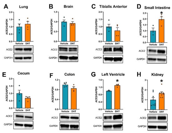 ACE2 protein expression regulation by DHT in different tissues. ACE2 protein expression was quantified by Western blot. ACE2 protein expression in the lung (A), brain (B), tibialis anterior (C), small intestine (D), cecum (E), colon (F), left ventricle (G), and kidney (H) of control and DHT-treated mice. Protein expression was normalized to GAPDH and expressed relative to control mice. Data analyzed by t-test. n = 3–8/group. *: p < 0.05.