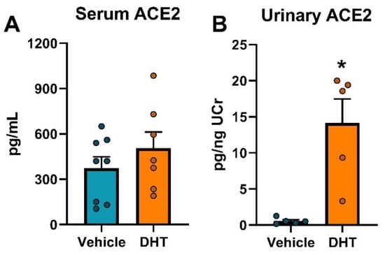 We, later on, analyzed the effect of excess androgens on soluble ACE2, both circulating and urinary. No significant effect of DHT treatment was observed in serum levels of ACE2 protein (Figure 5A). However, DHT-treated animals showed higher urinary ACE2 protein (14.13 ± 3.33 vs. 0.55 ± 0.19 pg/ng creatinine, Figure 5B).