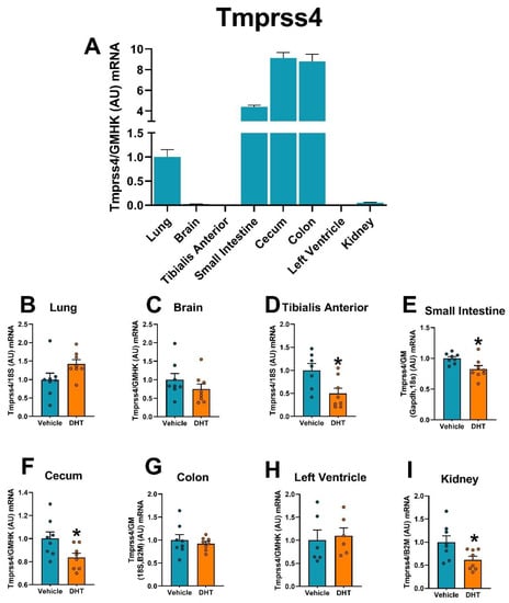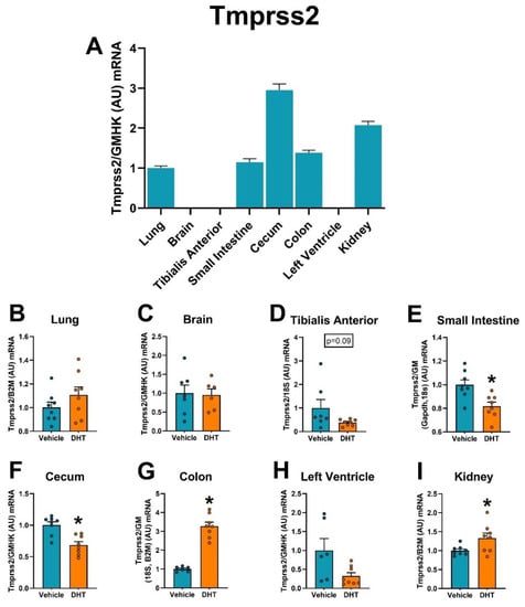 Tmprss2 mRNA expression regulation by DHT in different tissues. Tmprss2 mRNA expression was quantified by RT-qPCR. (A) Tmprss2 mRNA expression in control mice normalized to the geometric mean of all reference genes and expressed relative to lung tissue. (B–I) Tmprss2 mRNA expression in the lung (B), brain (C), tibialis anterior (D), small intestine (E), cecum (F), colon (G), left ventricle (H), and kidney (I) of control and DHT-treated mice normalized to the least variable reference gene or set of them and expressed relative to control mice. Data analyzed by t-test. n = 7–8/group. *: p < 0.05.