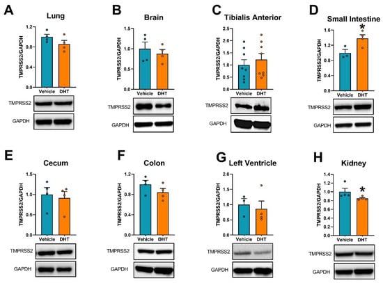 TMPRSS2 protein expression regulation by DHT in different tissues. TMPRSS2 protein expression was quantified by Western blot. TMPRSS2 protein expression in the lung (A), brain (B), tibialis anterior (C), small intestine (D), cecum (E), colon (F), left ventricle (G), and kidney (H) of control and DHT-treated mice. Protein expression was normalized to GAPDH and expressed relative to control mice. Data analyzed by t-test. n = 3–8/group. *: p < 0.05.