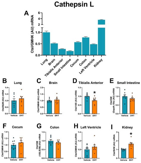 Cathepsin L mRNA expression regulation by DHT in different tissues. Cathepsin L mRNA expression was quantified by RT-qPCR. (A) Cathepsin L mRNA expression in control mice normalized to the geometric mean of all reference genes and expressed relative to lung tissue. (B–I) Cathepsin L mRNA expression in the lung (B), brain (C), tibialis anterior (D), small intestine (E), cecum (F), colon (G), left ventricle (H), and kidney (I) of control and DHT-treated mice normalized to the least variable reference gene or set of them and expressed relative to control mice. Data analyzed by t-test. n = 7–8/group. *: p < 0.05.