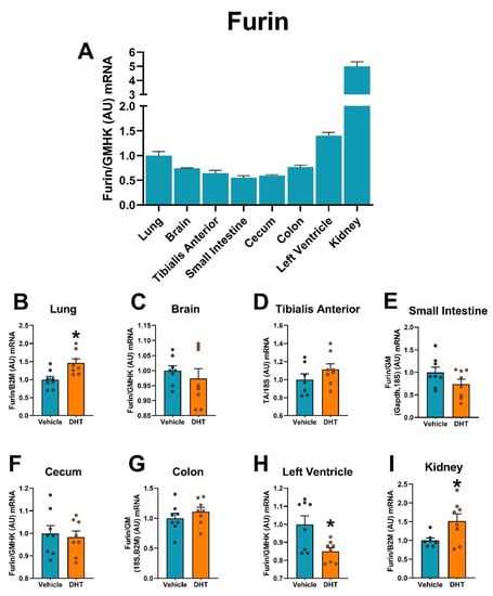 Furin mRNA expression regulation by DHT in different tissues. Furin mRNA expression was quantified by RT-qPCR. (A) Furin mRNA expression in control mice normalized to the geometric mean of all reference genes and expressed relative to lung tissue. (B–I) Furin mRNA expression in the lung (B), brain (C), tibialis anterior (D), small intestine (E), cecum (F), colon (G), left ventricle (H), and kidney (I) of control and DHT-treated mice normalized to the least variable reference gene or set of them and expressed relative to control mice. Data analyzed by t-test. n = 7–8/group. *: p < 0.05.
