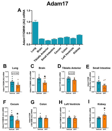 Adam17 mRNA expression regulation by DHT in different tissues. Adam17 mRNA expression was quantified by RT-qPCR. (A) Adam17 mRNA expression in control mice normalized to the geometric mean of all reference genes and expressed relative to lung tissue. (B–I) Adam17 mRNA expression in the lung (B), brain (C), tibialis anterior (D), small intestine (E), cecum (F), colon (G), left ventricle (H), and kidney (I) of control and DHT-treated mice normalized to the least variable reference gene or set of them, and expressed relative to control mice. Data analyzed by t-test. n = 7–8/group. *: p < 0.05.