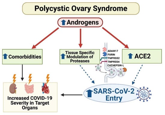 Polycystic ovary syndrome (PCOS) is the most common endocrine disorder in reproductive-age women affecting 5–20% of women worldwide [,]. PCOS is usually diagnosed by the Rotterdam criteria, which requires the presence of at least two of the following three criteria: hyperandrogenism (biochemical or clinical), ovulatory dysfunction (oligo- or anovulation), and polycystic ovary morphology []. Biochemical elevation in circulating androgens, or hyperandrogenemia, is present in ~80% of all women with PCOS [,]. A recent study showed that in a cohort of patients with COVID-19 admitted to the Intensive Care Unit, the majority (60%) of female patients had elevated testosterone []. Moreover, a recent cross-sectional case-control study showed that COVID-19 positive outpatient women with PCOS had a higher incidence of COVID-19-associated symptoms such as low-grade fever, anosmia, ageusia, dry cough, among others, when compared with non-hyperandrogenemic COVID-19 positive women []. A large epidemiological study of more than 20,000 women with PCOS, matched 1:4 with control women, found a 36% increase risk for COVID-19 compared to controls after adjusting for BMI, age, and impaired glucose regulation []. This study further highlights the relevance to this population and the need for heightened focus. However, those relationships have not been evaluated on a larger scale to assess hospitalizations or death. Interestingly, circulating androgens in women with PCOS are positively associated with the severity of metabolic dysfunction and obesity [,,,], both being well-recognized comorbidities in the severity of COVID-19 [].