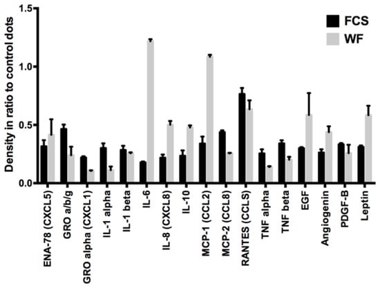 First, the different cytokines in WF and fetal calf serum (FCS) were analyzed. For this purpose, a dot blot assay was performed. Cytokines responsible for angiogenesis, proliferation, inflammation, and immune modulation were examined. The results of the dot blot assays were quantified densitometrically and presented graphically (see Figure 1). We could show distinct differences between WF and FCS. Factors that were considerably more present in WF than in FCS were interleukin (IL)-6, IL-8, IL-10, chemokine (C-C motif) ligand 2 (CCL2) (monocyte chemoattractant 1 (MCP-1)), EGF, angiogenin, and leptin. Factors that were clearly less present in WF than in FCS were growth related oncogene (GRO), chemokine (C-X-C motif) ligand 1 (CXCL1), IL-1α, CCL8 (MCP-2), RANTES, tumor necrosis factor α (TNFα), and TNFβ. The cytokine concentrations differed between the donors. However, overall clustering of cytokine expression was comparable between the different individuals (see Figure 2).