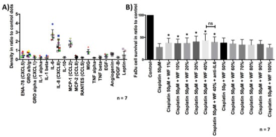 (A) Semiquantitative cytokine contents analysis of WF from all seven donors. One dot shows the result of one donor. High levels of IL-6, IL-8, MCR-1, MIG (monokine induced by gamma interferon; CXCL9) are detectable in WF compared with control dots. (B) FaDu cell survival was measured by flow cytometry. Previously, cells were treated with cisplatin 50 µM and ±WF at different concentrations. The cultivation with WF at a concentration of 1%, 10%, 20%, 30%, 40%, and 40% + anti-IL6 resulted in a significant improvement of cell survival after cisplatin treatment, compared with cultivation with expansion medium (n = 7). The addition of anti-IL6 had no statistically significant effect on cell survival. * p < 0.05. n.s. marks the not significant results.
