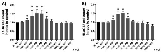 (A) FaDu and (B) HLaC78 growth in dependence of the WF concentration: The maximum cell proliferation in dependence of WF concentration was reached by incubating with RPMI medium supplemented with 30% and 40% WF (n = 3). Significant differences compared to the control (RPMI) were marked with an *.