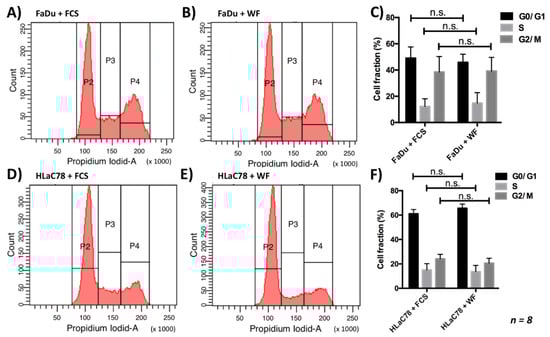 There is no change in the cell cycle distribution by incubation of (A–C) FaDu and (D–F) HLaC78 cells with 40% WF compared with incubation with FCS. This experiment was repeated with WF of 8 different donors. n.s. marks the not significant results.