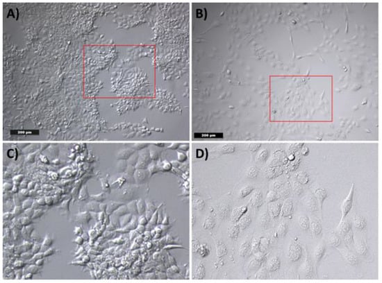 Cell morphology of tumor cells by incubation with (A) RPMI-EM and (B) WF. (C) and (D) show a digital magnification of the red marked area of (A) and (B), respectively. After incubation with (A) RPMI-EM, the tumor cells show a polygonal epithelial appearance. An elongated fibroblast-like cell morphology was observed after incubation with WF.