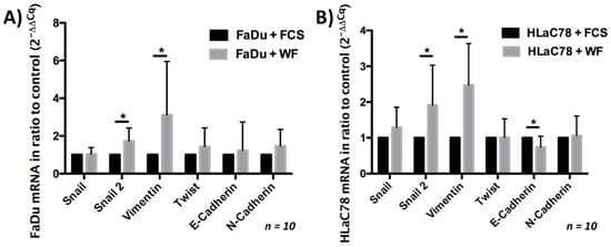 Expression of epithelial and mesenchymal markers after (A) FaDu and (B) HLaC78 incubation with WF. The expression of the mesenchymal markers Snail 2 and vimentin is significantly enlarged after incubation with WF in (A) FaDu and (B) HLaC78. Significant lower levels of the epithelial marker E-cadherin were detected in HLaC78 after incubation with WF (* p < 0.05).