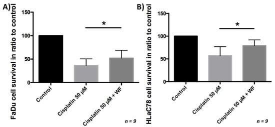 (A) FaDu and (B) HLaC78 cell survival measured by flow cytometry after incubation with cisplatin 50 µM and ±WF. There is significantly higher cell survival by cultivation of (A) FaDu and (B) HLaC78 with medium containing WF (n = 9).