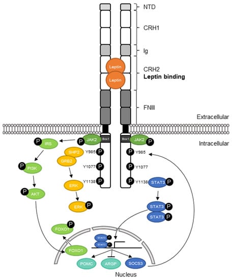 - Banks, A.S.; Davis, S.M.; Bates, S.H.; Myers, M.G. Activation of Downstream Signals by the Long Form of the Leptin Receptor. J. Biol. Chem. 2000, 275, 14563–14572. [Google Scholar] [CrossRef]