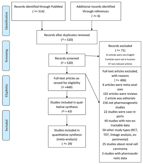 A systematic review of the literature in the PubMed database identified 492 articles. After extensive study, 29 articles were included in the meta-analysis. Figure 1 shows the reasons for excluding articles. In total, 11 genes (ABCB1, CYP2C9, CYP2C19, CYP3A5, IL-6, IL-10, ITPA, MIF, TGFB1, TNF, TPMT) and 16 polymorphisms located in these genes were studied.
