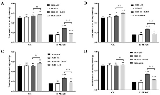 Total antioxidant capacity analysis. (A) Analysis of total antioxidant capacity of recombinant strains BL21-DS + DrHD and BL21-DrHD. (B) Analysis of total antioxidant capacity of recombinant strains BL21-DS + BnHD and BL21-BnHD. (C) Analysis of total antioxidant capacity of recombinant strains BL21-DS + CeHD and BL21-CeHD. (D) Analysis of total antioxidant capacity of recombinant strains BL21-DS + YlHD and BL21-YlHD. The symbols ‘ns’, ‘*’, ‘**’ and ‘***’, respectively, represent ‘no significantly different (p > 0.05)’, ‘a significant difference (0.01 < p < 0.05)’, ‘an extremely significant difference (0.001 < p < 0.01)’, and ‘the most significant difference (p < 0.001)’.