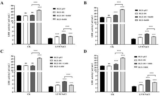 Lactate dehydrogenase activity analysis. (A) Analysis of lactate dehydrogenase activity of recombinant strains BL21-DS + DrHD and BL21-DrHD. (B) Analysis of lactate dehydrogenase activity of recombinant strains BL21-DS + BnHD and BL21-BnHD. (C) Analysis of lactate dehydrogenase activity of recombinant strains BL21-DS + CeHD and BL21-CeHD. (D) Analysis of lactate dehydrogenase activity of recombinant strains BL21-DS + YlHD and BL21-YlHD. The symbols ‘ns’ and ‘***’, respectively, represent ‘no significantly different (p > 0.05)’, ‘a significant difference (0.01 < p < 0.05)’, ‘an extremely significant difference (0.001 < p < 0.01)’, and ‘the most significant difference (p < 0.001)’.