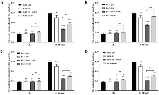Analysis of MDA production. (A) Analysis of MDA production of recombinant strains BL21-DS + DrHD and BL21-DrHD. (B) Analysis of MDA production of recombinant strains BL21-DS + BnHD and BL21-BnHD. (C) Analysis of MDA production of recombinant strains BL21-DS + CeHD and BL21-CeHD. (D) Analysis of MDA production of recombinant strains BL21-DS + YlHD and BL21-YlHD. The symbols ‘ns’, ‘*’, ‘**’ and ‘***’, respectively, represent ‘no significantly different (p > 0.05)’, ‘a significant difference (0.01 < p < 0.05)’, ‘an extremely significant difference (0.001 < p < 0.01)’, and ‘the most significant difference (p < 0.001)’.