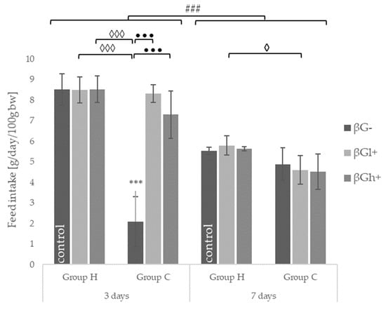 Feed intake 3 and 7 days after TNBS or 0.9% NaCl administration (mean ± SE) (n = 8 in each group). Significantly different from the control group *** p < 0.001; in the same experimental groups with regard to beta-glucans treatment ••• p < 0.001; between the experimental groups with regard to beta-glucans treatment ◊ p < 0.05, ◊◊◊ p < 0.001; in the same experimental groups with regard to beta-glucan treatment at different time points ### p < 0.001 (two-way ANOVA with Tukey’s post-hoc test).