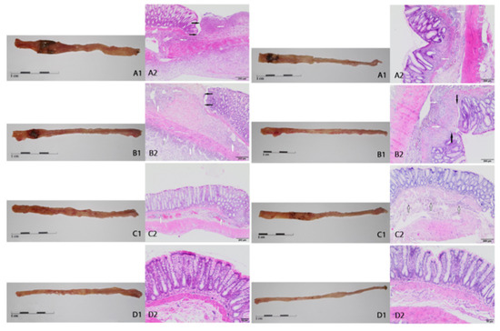 Macroscopic and microscopic changes in the descending colon 3 (left side) and 7 (right side) days after TNBS administration. (A1,A2): colitis CβG− groups; (B1,B2): colitis CβGl+ groups; (C1,C2): colitis CβGh+ groups; (D1,D2): health HCβG− groups. White arrows indicate multifocal/diffuse inflammatory infiltration of the mucosa and/or submucosa of varying severity, black arrows indicate margins of ulceration. Hematoxylin–eosin staining, magnification: (B2) left side and (C2) left side—4x; (A2) both sides, (B2) right side, (C2) right side—10x; (D2) both sides—20x. Various magnifications were used to better visualization of different lesions.