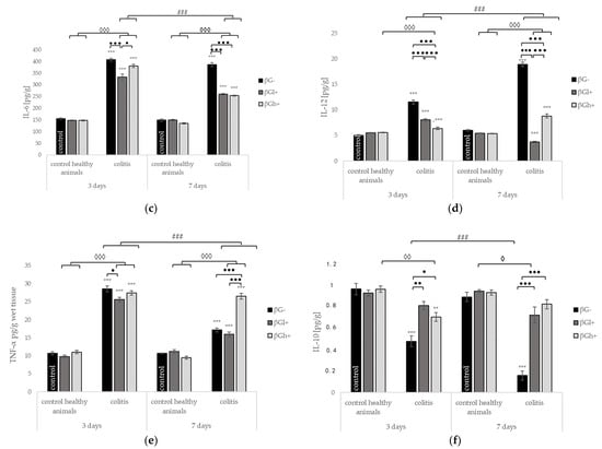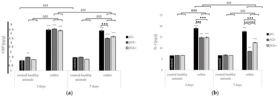 Compared to the control group (HβG-), the induction of inflammation by the rectal administration of TBNS without nutritional intervention (group CβG-) at both time points (3 and 7 days) caused a significant increase in the levels of all pro-inflammatory cytokines (IL-1, IL-6, IL-12, and TNF-α) and C-reactive protein (CRP), whereas a decrease in the level of the anti-inflammatory cytokine IL-10 was observed. The increase in some pro-inflammatory cytokines (TNF-α, IL-1) and the decrease in IL-10 level in the colon wall were significantly greater at 3 days, whereas the increase in IL-12 was much higher at 7 days. The colon levels of CRP and IL-6 were comparable at 3 and 7 days. In the colitis groups, the consumption of feed containing oat beta-glucans resulted in a significant decrease in the level of all measured pro-inflammatory cytokines and an increase in the level of anti-inflammatory cytokine. Two-way ANOVA confirmed that these effects depended on both the molar mass of beta glucans and the length of the animal’s feeding period.