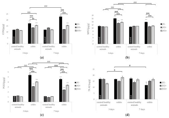 The levels of COX, MPO, and PGE2 were significantly decreased in colitis rats fed with feed containing beta-glucans compared to rats with colitis fed with feed without beta-glucans at both time points. Rats from the CβGl+ group showed a greater reduction in COX and PGE2 concentrations, rats from the CβGl+ and CβGh+ groups showed a greater reduction in MPO concentration (Figure 4a–c, respectively). The addition of low and high molar mass beta-glucans reduced the MPO level to the value detected in the control group (7CβGl+ and 7CβGh+ vs. 7HβG-). The consumption of feed with low molar mass beta-glucans also reduced the COX level in colitis rats to the value detected in the control group (7CβGl+ vs. 7HβG-). The TXA2 level in the colon did not significantly change at 3 days after TNBS administration, whereas at 7 days, the level of TXA2 significantly increased in the CβG- group as compared to that in the HβG- group. The consumption of feed containing both fractions of beta-glucans retained the TXA2 level in colitis rats to the value detected in the control group (Figure 4d).
