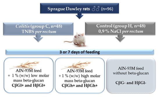 Briefly, in colitis groups (C, n = 48) local colon inflammation was induced by TNBS (2,4,6,6-trinitrobenzenesulfonic acid) ethanol solution rectal administration, whereas in control groups (H, n = 48) (shame-operated), the same volume of 0.9% NaCl was given. Then, rats from C and H groups were divided into 3 nutritional subgroups (n = 8 each) which received for 3 or 7 days after TNBS/NaCl administration 3 types of feed differing in the addition of the oat beta-glucan fraction according to the group symbols below: CβGl+ and HβGl+ received for 3 or 7 days AIN-93M feed with 1% (w/w) low molar mass beta-glucan; CβGh+ and HβGh+ received for 3 or 7 days AIN-93M feed with 1% (w/w) high molar mass beta-glucan; CβG- and HβGl- received for 3 or 7 days AIN-93M feed without beta-glucan Figure 5. Feed intake was measured every 2 days by calculating the standardized intake (g/day/100 g rat body weight); final body weight was measured 12 h before euthanasia. After 3 or 7 days of feeding, rats were introduced into deep anesthesia (Isoflurane inhalation), bled from the heart, and then, the large intestine was removed to determined the stage of inflammation. After assessing the location of macroscopic lesions in the large intestine, the damaged sections of the colon were excised, part of them were fixed in 4% buffered formaldehyde, and the remaining fragments were frozen in liquid nitrogen and stored in −80 °C until biochemical analysis. Details of tissue collection and preparation as well as morphological criteria (scores) of colitis severity and microscopic colonic tissues damage (scores) were described in our previous paper [43].