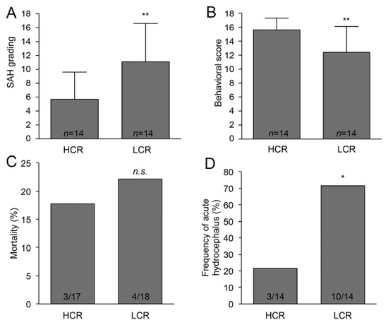 LCR rats had worse SAH grades and behavioral scores, as well as a higher occurrence of hydrocephalus. SAH grades (A) and behavioral scores (B) in HCR and LCR rats. ** p < 0.01 versus HCR group. The % of HCR and LCR rats that died after SAH (C) and had acute hydrocephalus 24 h after SAH (D); * p < 0.05, n.s. (not significant) p > 0.05 versus HCR group.