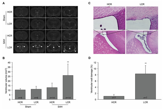 SAH induced hydrocephalus development and ventricular wall damage 24 h after endovascular perforation in LCR rats. (A) Representative T2-weighted MRI showing coronal brain section 24 h after SAH or a sham operation in LCR and HCR rats. The hyperintense signal shows brain ventricles. Enlarged ventricles in the LCR rats are indicated by white arrowheads. (B) Quantification of the ventricular volume from T2-weighted MRI 24 h after SAH or a sham operation in LCR and HCR rats. (C) Representative hematoxylin and eosin staining of brain sections showing ventricular wall damage 24 h after SAH or a sham operation in LCR and HCR rats. The top micrographs are enlargements of the boxed areas in the lower micrographs. Scale bars: top, 50 μm; bottom, 200 μm. (D) Quantification of ventricular wall damage 24 h after SAH or a sham operation (percentage of the damaged ventricular wall in the total ventricle wall length). Values are mean ± SD; ** p < 0.01 versus HCR group.